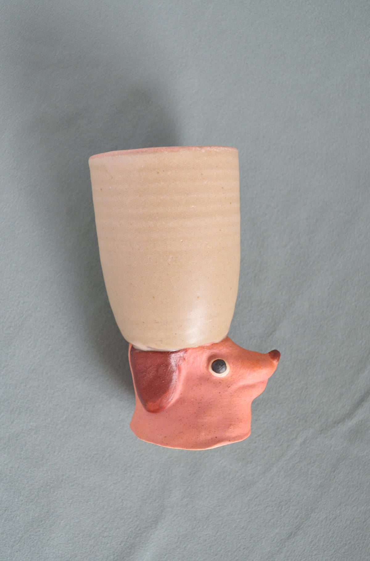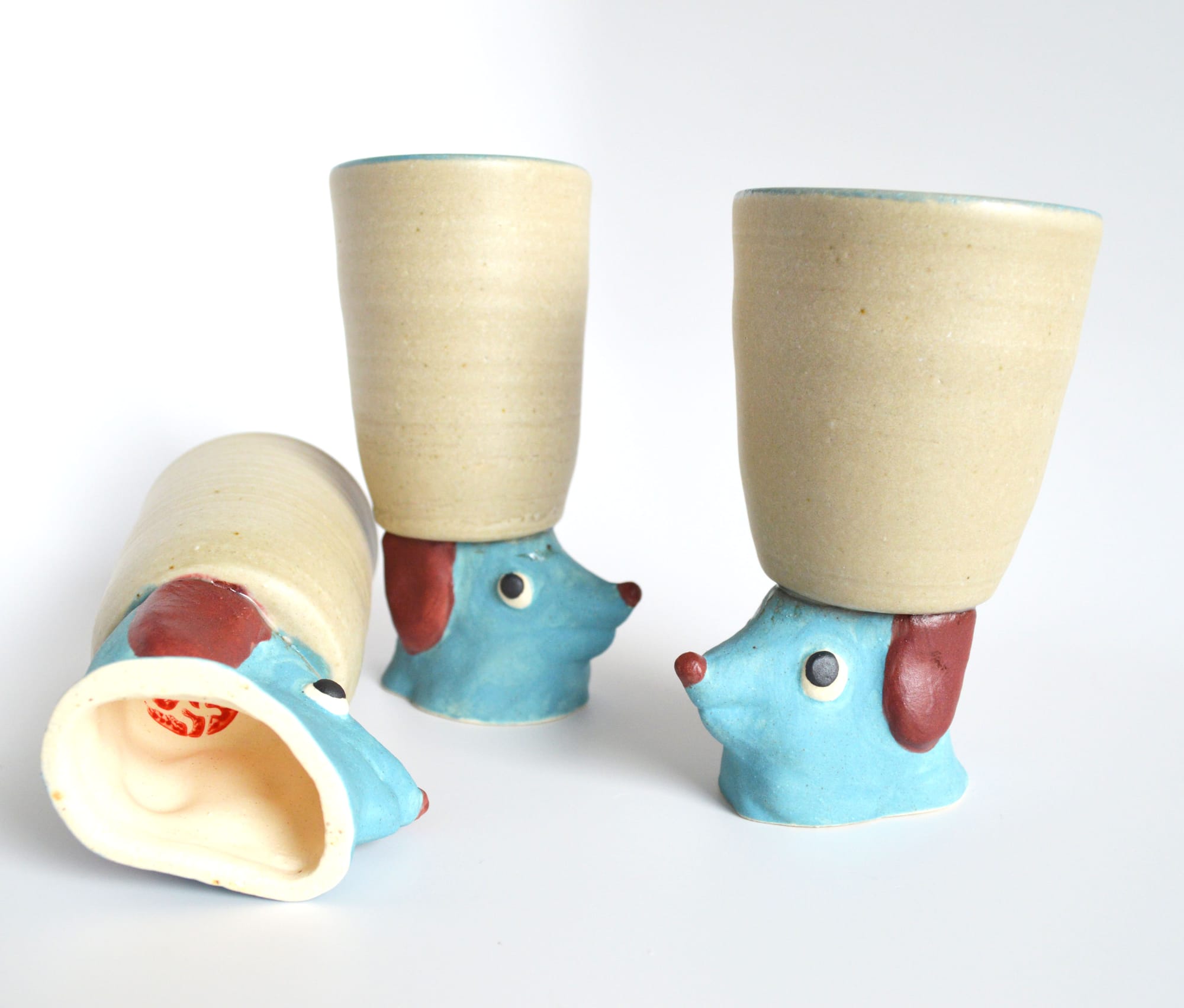 The painted blue & pink dogs with Oatmeal satin glaze on top. The photo on the left is before firing them and the other two photos are them after firing.