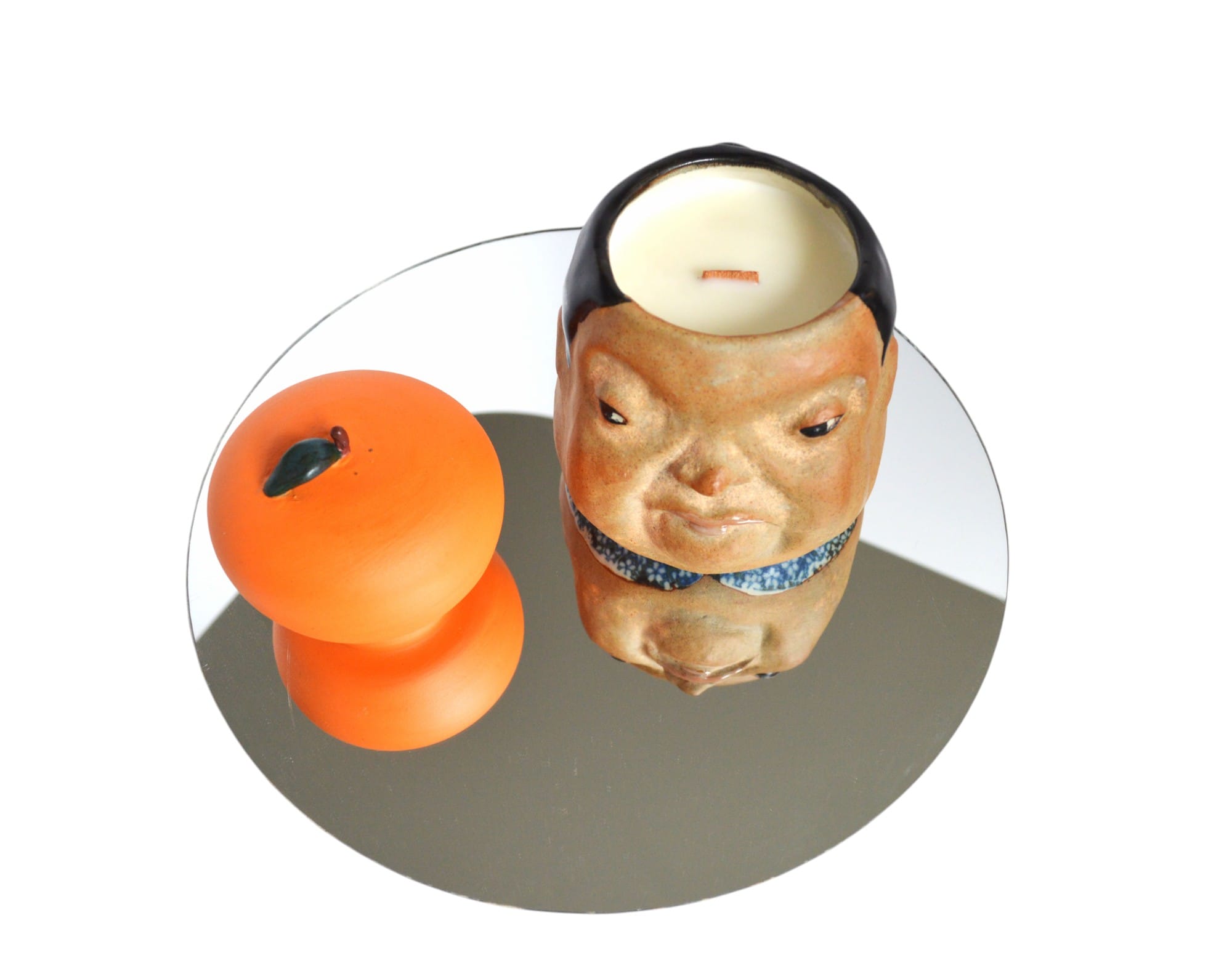 The candles are hand poured, infused with good energy (thank you Rachel for your energetic process), and made with soy wax. When you are done with the candle it cleans easily out of the vessel for you to use for other things. The tangerine that rests on top can also fit on most cups~ I like to use my lid on my cup of coffee to keep it warm.